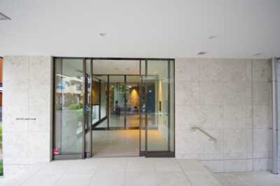 外観は代々木公園のある東側を向く造りでガラス面を多用したデザイン。通り沿いの緑や代々木公園の緑がガラス面に反射して美しい。