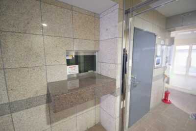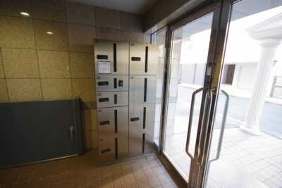 ライトグレーの大判タイル貼りの外観でエントランスセキュリティはオートロックを採用しています。不在時に便利な宅配ボックスも標準装備です。