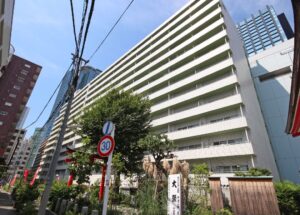 ハイネスロフティは1979年築、地上13階建て127邸。外観を見たらわかるけど3階までの出っ張っているとこまではオフィスフロア。エントランスも住居とオフィスは2手に分かれるので不特定多数の入れ違いは意外と少ないです。